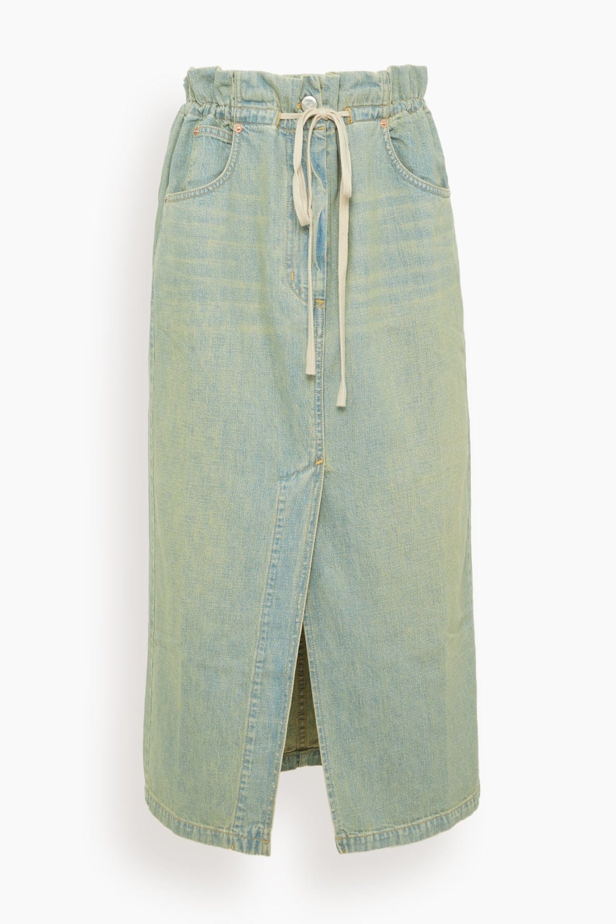The Rachel Comey Carta Skirt features the relaxed look and feel you love from this designer. This midi skirt is crafted in washed denim with a drawstring waistband. Wear yours with a t-shirt and sandals. FIT DESCRIPTION MODEL MEASUREMENTS - Fits true to size, take your normal size - Denim skirt - Midi length - Relaxed fit - Front slit - Drawstring paperbag waistline - 100% Cotton - Celeste is wearing a size 2 - Bust: 35" - Waist: 25.5" - Hips: 34" - Height: 5’10”