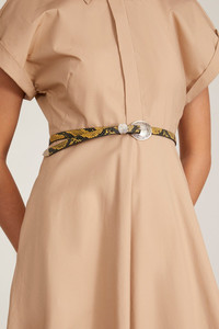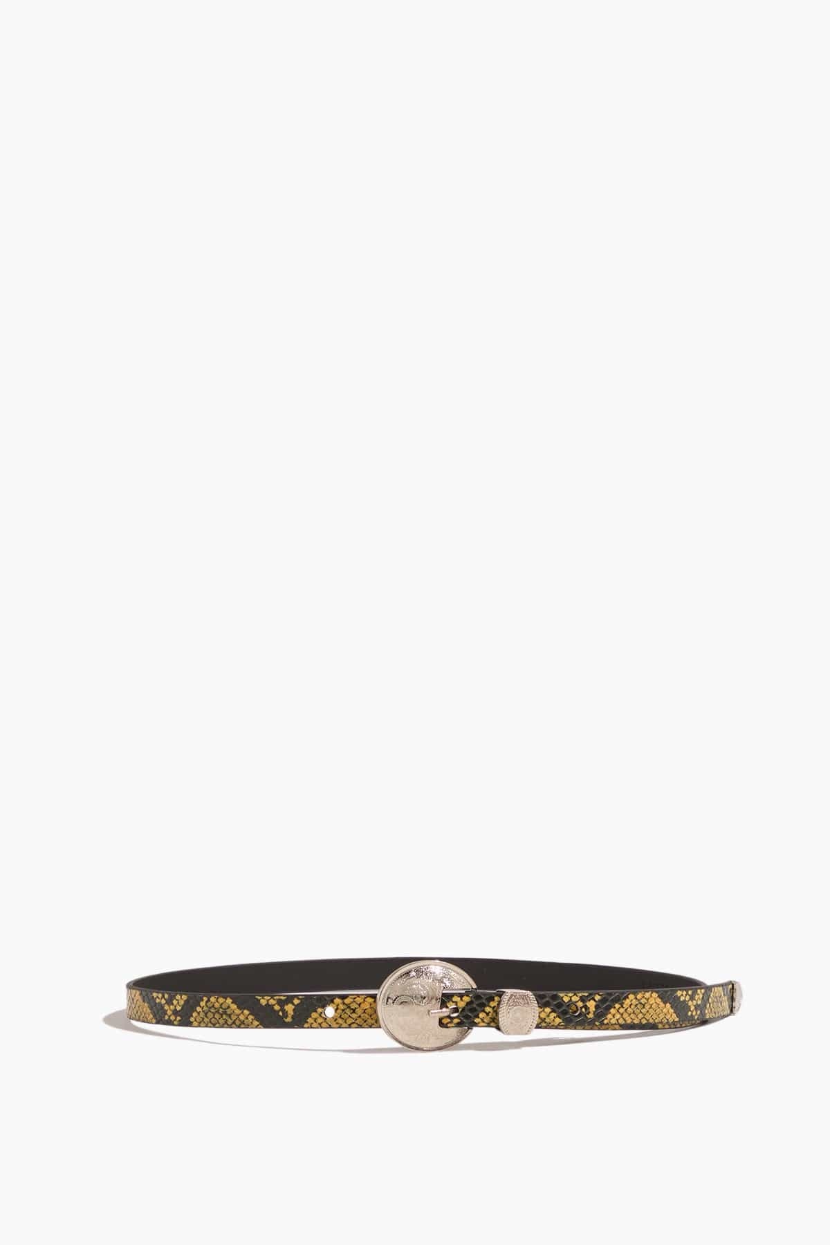 The Rachel Comey Cowboy Waist Belt in Yellow Multi is a thin leather belt in snakeskin-embossed leather with silver engraved buckle for a Western-inspired detail. FIT DETAILS - Thin belt - 100% Leather, snakeskin-embossed - Silver engraved buckle