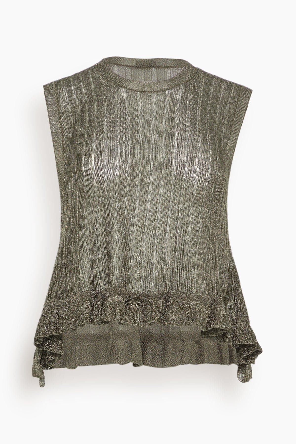 The Rachel Comey New Aires Top is crafted in a beautiful metallic knit. You'll love the loose silhouette of this top with a ruffled hemline. Wear yours with jeans and flats. FIT DESCRIPTION MODEL MEASUREMENTS - Fits true to size, take your normal size - Sleeveless sweater - Loose fit - Ruffled hemline - Metallic threading - 100% 74% Viscoe 26% Lurex - Emma is wearing a size XS - Bust: 32” - Waist: 25” - Hips: 34” - Height: 5’7”