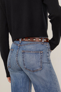 The Rachel Comey Studded Hip Belt in Saddle is a studded leather belt with bronze buckle. FIT DETAILS - 100% Leather - Bronze buckle - Stud details - Made in Peru