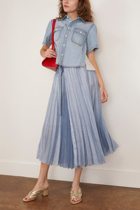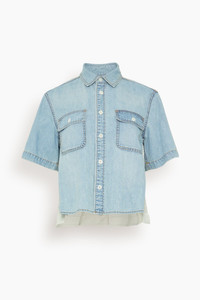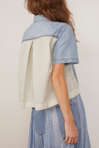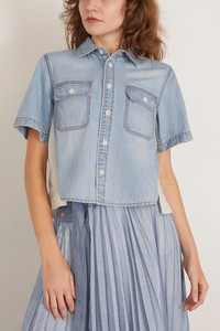 The Sacai Denim Shirt features their signature mixed materials. You'll love the boxy silhouette and contrasting nylon back of this denim button down. Wear yours with trousers and loafers. FIT DESCRIPTION MODEL MEASUREMENTS - Fits true to size, take your normal size - Denim shirt - Button down front - Boxy silhouette - Mixed material - Flap pockets - 100% Cotton, 100% Nylon - Mya is wearing a size 1/ XS - Bust: 32" - Waist: 25" - Hips: 34" - Height: 5’9"