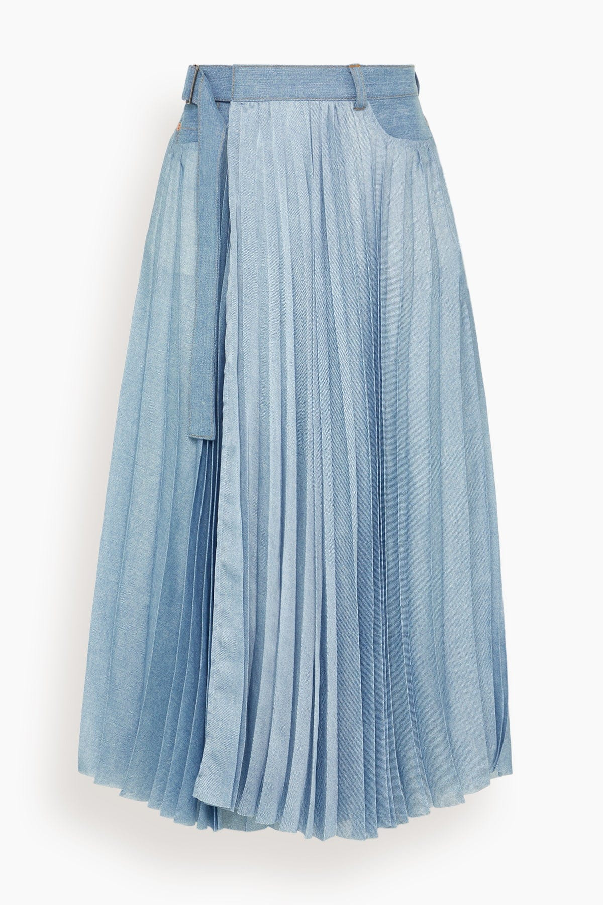 The Sacai Denim Skirt features their signature silhouette. You'll love the allover pleating of this midi skirt in a lightwash denim. Wear yours with a t-shirt and loafers. FIT DESCRIPTION MODEL MEASUREMENTS - Fits true to size, take your normal size - Denim skirt - Midi length - Allover pleating - High rise - Back patch pockets - Belted waistband - 100% cotton - Mya is wearing a size 1/ XS - Bust: 32" - Waist: 25" - Hips: 34" - Height: 5’9"