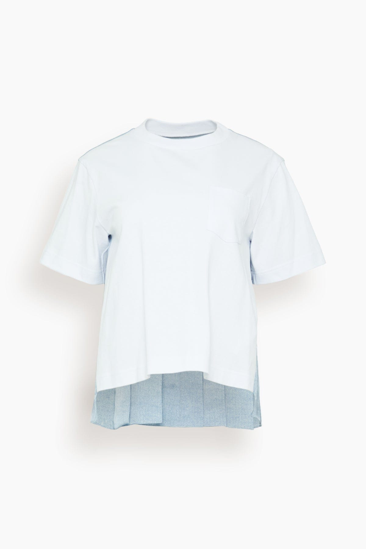 The Sacai Denim x Cotton Jersey T-Shirt features their signature mixed material silhouette. You'll love the classic cotton front of this t-shirt with a contrasting pleated denim back. Wear yours with trousers and loafers. FIT DESCRIPTION MODEL MEASUREMENTS - Fits true to size, take your normal size - T-shirt - Mixed material - Pleated back - Crew neckline - 100% Cotton - Mya is wearing a size 1/ XS - Bust: 32" - Waist: 25" - Hips: 34" - Height: 5’9"