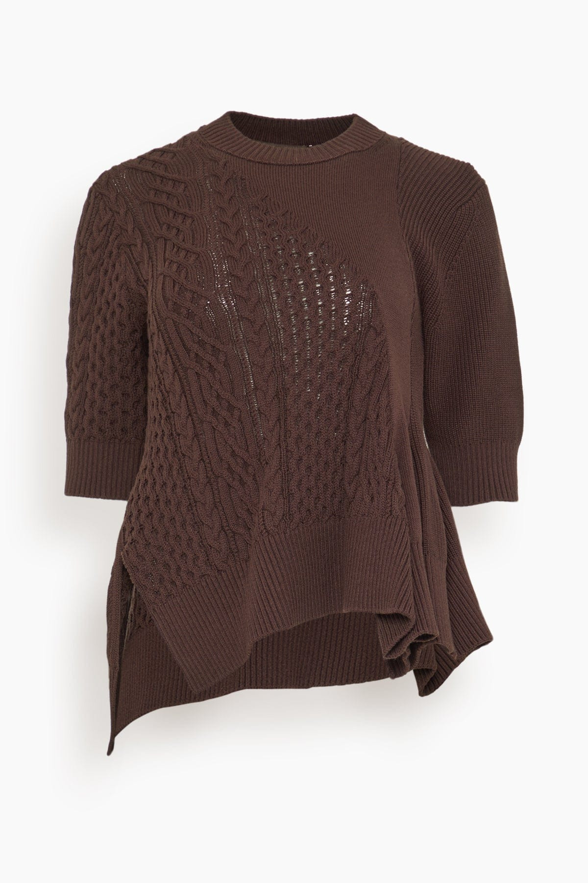 The Sacai Knit Pullover features the unique details you love from this designer. This sweater features an asymmetrical hemline with a relaxed fit. Wear yours with trousers and loafers. FIT DESCRIPTION MODEL MEASUREMENTS - Fits true to size, take your normal size - Sweater - Relaxed fit - Crew neckline - Asymmetrical hemline - Mya is wearing a size 1/ XS - Bust: 32" - Waist: 25" - Hips: 34" - Height: 5’9"