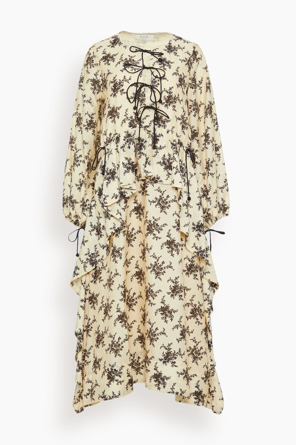 The SEA Joan Print Tie Front Midi Dress features the bohemian flare you love from this designer. This midi dress has ruffle detailing and a voluminous fit in a bold floral print. Wear yours with boots and a shoulder bag. - Midi length - Relaxed fit - Voluminous sleeves - Peplum ruffle waistline - Tie front closure - Asymmetrical hemline - 80% viscose, 20% nylon