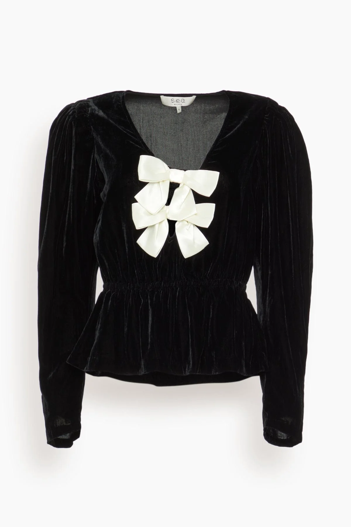The SEA Seraphine Velvet Long Sleeve Top features the feminine details you love from this designer. This top is crafted in velvet with a peplum hemline and bow detail at the chest. Wear yours with heels and jeans. FIT DESCRIPTION MODEL MEASUREMENTS - Fits true to size, take your normal size - Long sleeve top - Puffed sleeves - V-neckline with bow detail - Peplum hemline - Velvet - 80% nylon, 20% rayon - Charley is wearing a size XS - Bust: 33” - Waist: 25” - Hips: 34” - Height: 5’8”