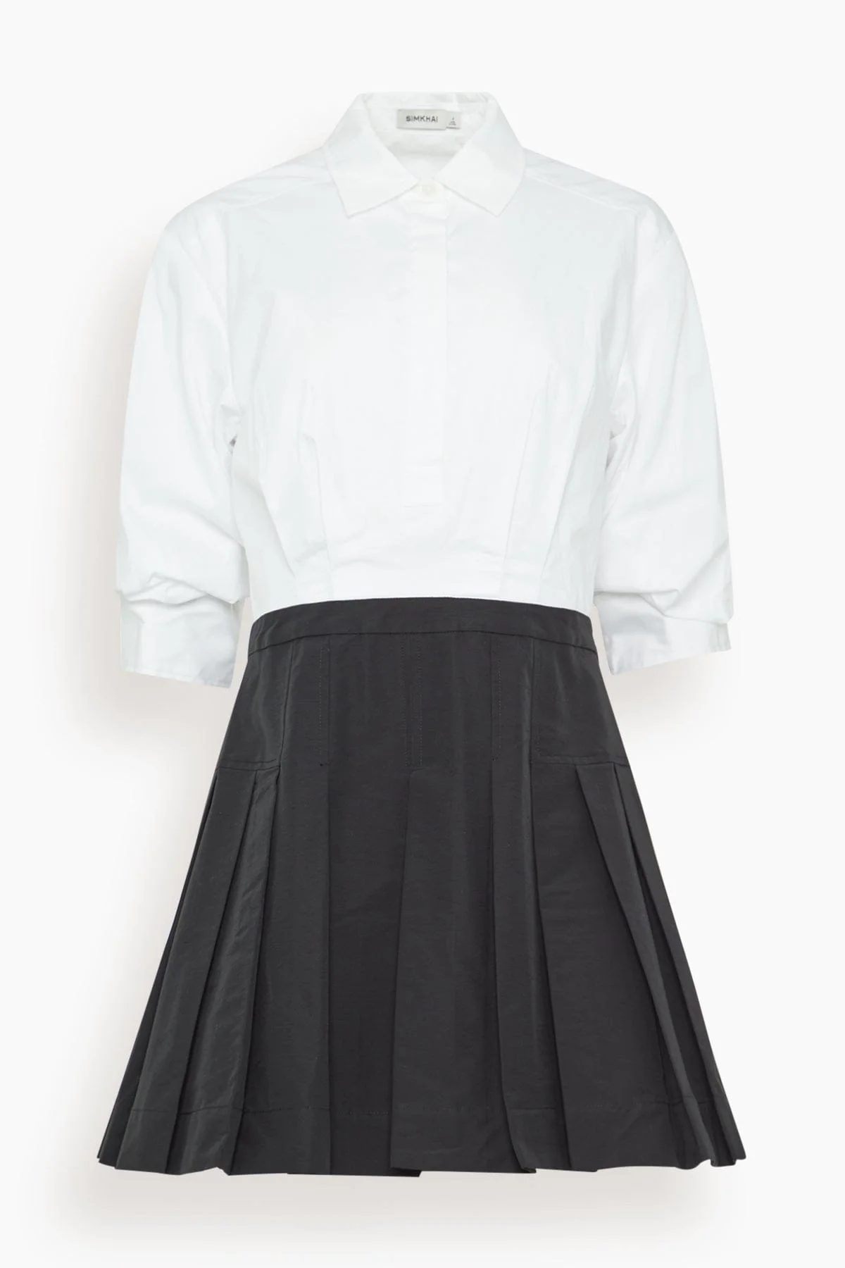 The Simkhai Sinclair Short Sleeve Combo Mini Dress is perfect for work. This mini dress features a pleated skirt with a contrasting button top. Wear yours with boots and a shoulder bag. - Mini length - Button front - Puffed sleeves - Pleated skirt - Fit and flare silhouette - 62% Cotton 38% Polyamide, Contrast: 100% Cotton