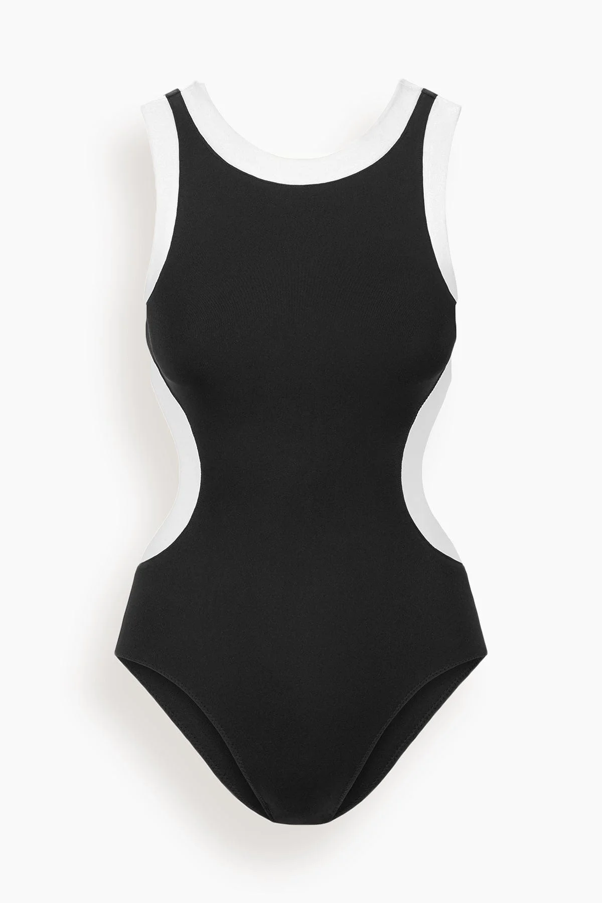 The Staud Dolce One Piece will have you ready for a day at the beach or pool. This one piece features cutout sides with a contrasting trim. Wear yours with a coverup and sandals. - One piece swimsuit - Cutout sides - Back clasp - Moderate coverage - 82% Nylon, 18% Spandex, Trim: 67% Recycled Polyester, 33% Spandex, Lining: 80% Nylon, 20% Spandex