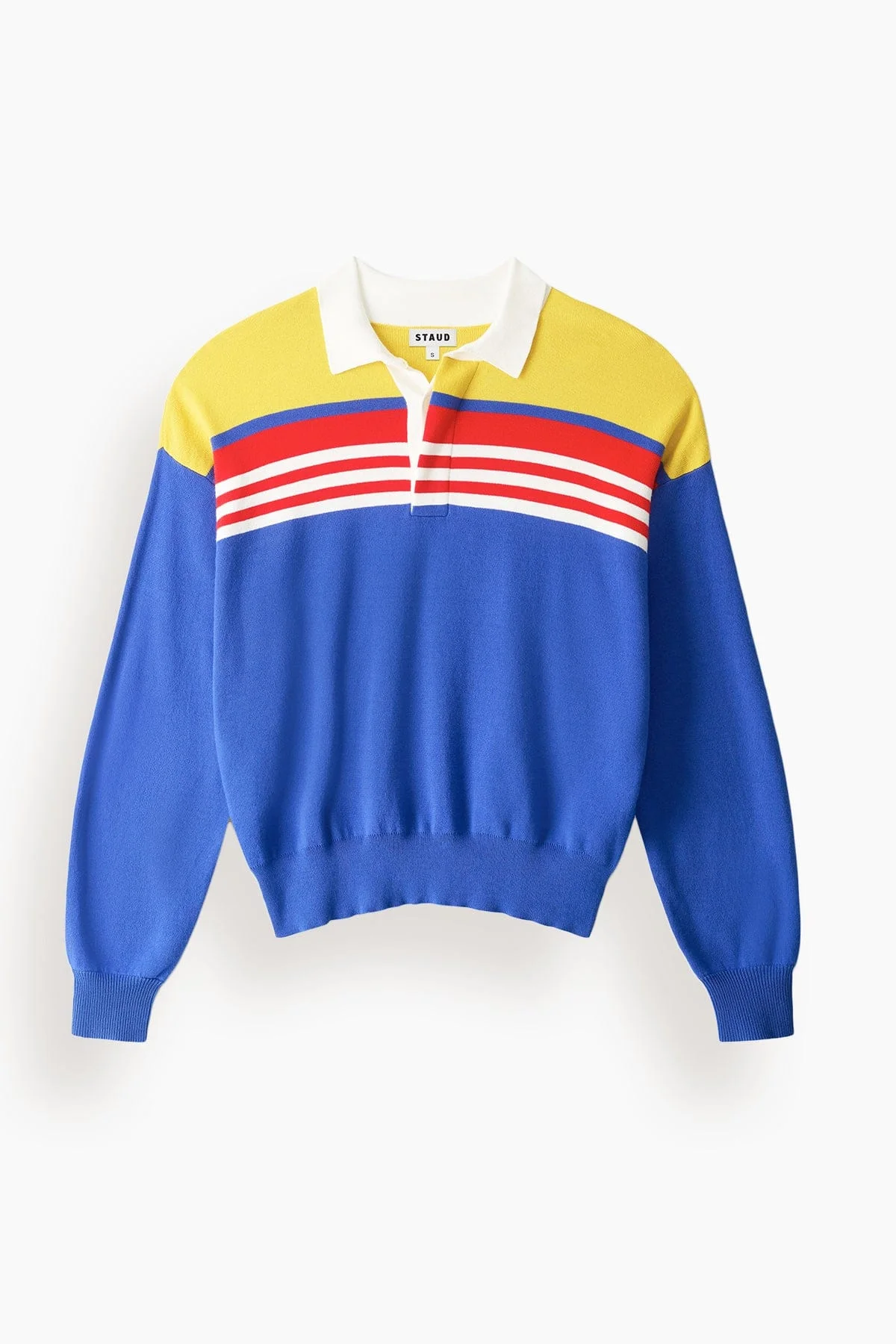 A Staud Sail Top in Royal Multi Stripe is a cotton polo knit with a contrast white collar and bold color-blocked stripes. The relaxed fit makes it perfect for effortless everyday styling—dress it up or down depending on your mood. 100% Cotton