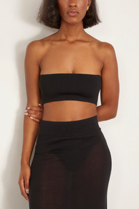 The Toteme Bandeau Knit is a must-have piece from their PreFall 25 Collection. This bandeau top is crafted in their signature compact jersey with a slim silhouette. Wear yours with the matching skirt and sandals. FIT DESCRIPTION MODEL MEASUREMENTS - Fits true to size, take your normal size - Bandeau top - Slim silhouette - 53% viscose, 45% polyamide recycled, 2% elastane - Kyndal is wearing a size XS - Bust: 32" - Waist: 24" - Hips: 35“ - Height: 5’6”
