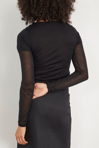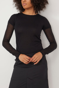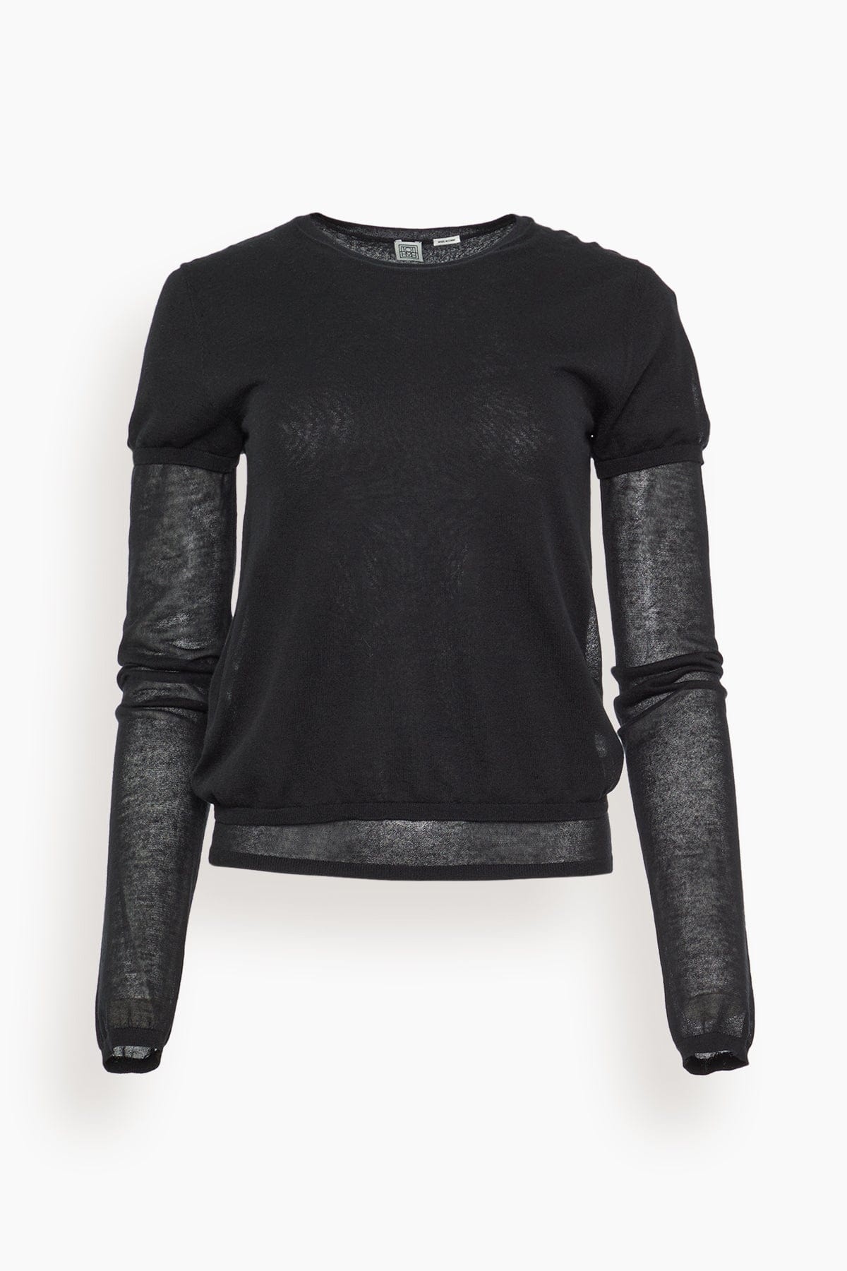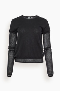 The Toteme Layered Knit Tee takes it's inspiration from the 90's. This t-shirt offers a layered look with semi-sheer long sleeves in a cashmere blend. Wear yours with jeans and sandals. FIT DESCRIPTION MODEL MEASUREMENTS - Fits true to size, take your normal size - T-shirt - Layered sleeves - Crew neckline - Relaxed fit - 88% Lyocell, 10% cashmere, 2% polyamide - Celeste is wearing a size XS - Bust: 35" - Waist: 25.5" - Hips: 34" - Height: 5’10”