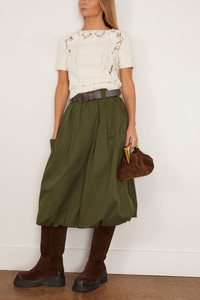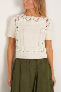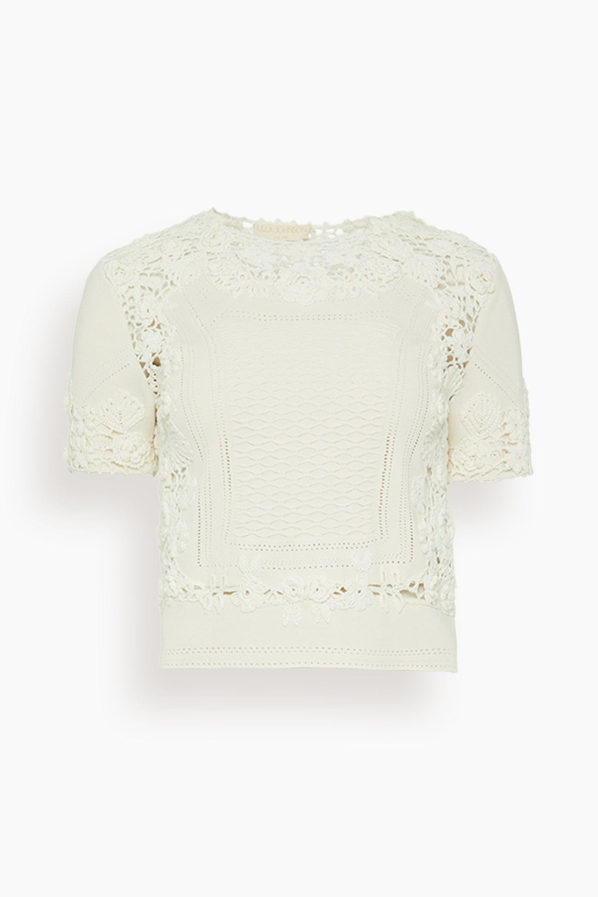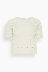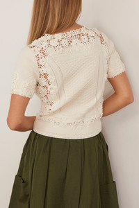 The Ulla Johnson Stella Short Sleeve Knit Top is a beautiful piece from their PreFall 25 Collection. This top features hand crochet details on a knit bodice. Wear yours with jeans and flats. FIT DESCRIPTION MODEL MEASUREMENTS - Fits true to size, take your normal size - Knit top - Hand crochet - Crew neckline - 47% Cotton, 44% Viscose, 9% Polyester - Charley is wearing a size P - Bust: 33” - Waist: 25” - Hips: 34” - Height: 5’8”
