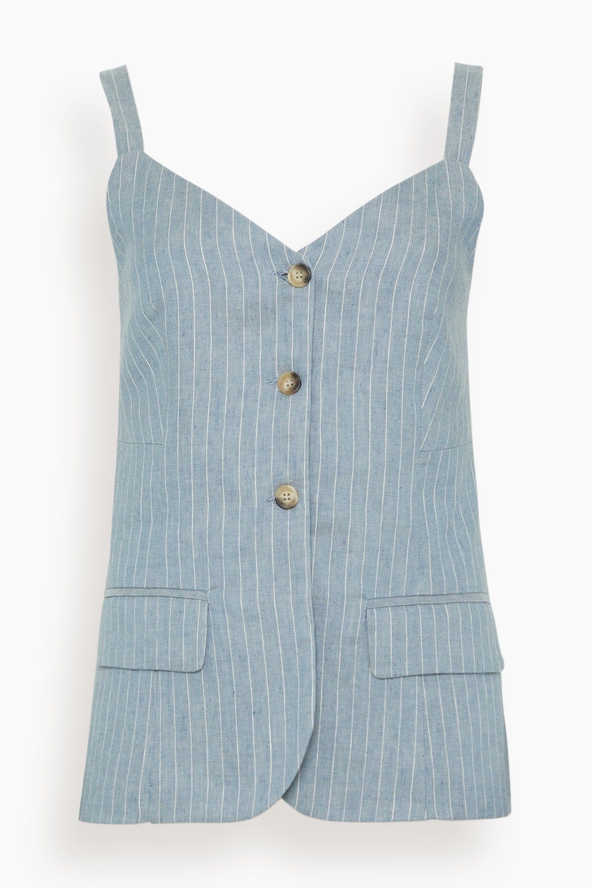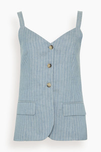 The Vanessa Bruno Elai Top is a must-have piece from their Spring 25 Collection. This sleeveless top features a fitted silhouette with a button front in a pinstriped cotton and linen blend. Wear yours with the matching shorts. FIT DESCRIPTION MODEL MEASUREMENTS - Fits true to size, take your normal size - Sleeveless top - Button front - Fitted silhouette - Flap pockets - Linen/cotton - Harriet is wearing a size 34/ 2 US - Bust: 32" - Waist: 24" - Hips: 30.5" - Height: 5’8.5”