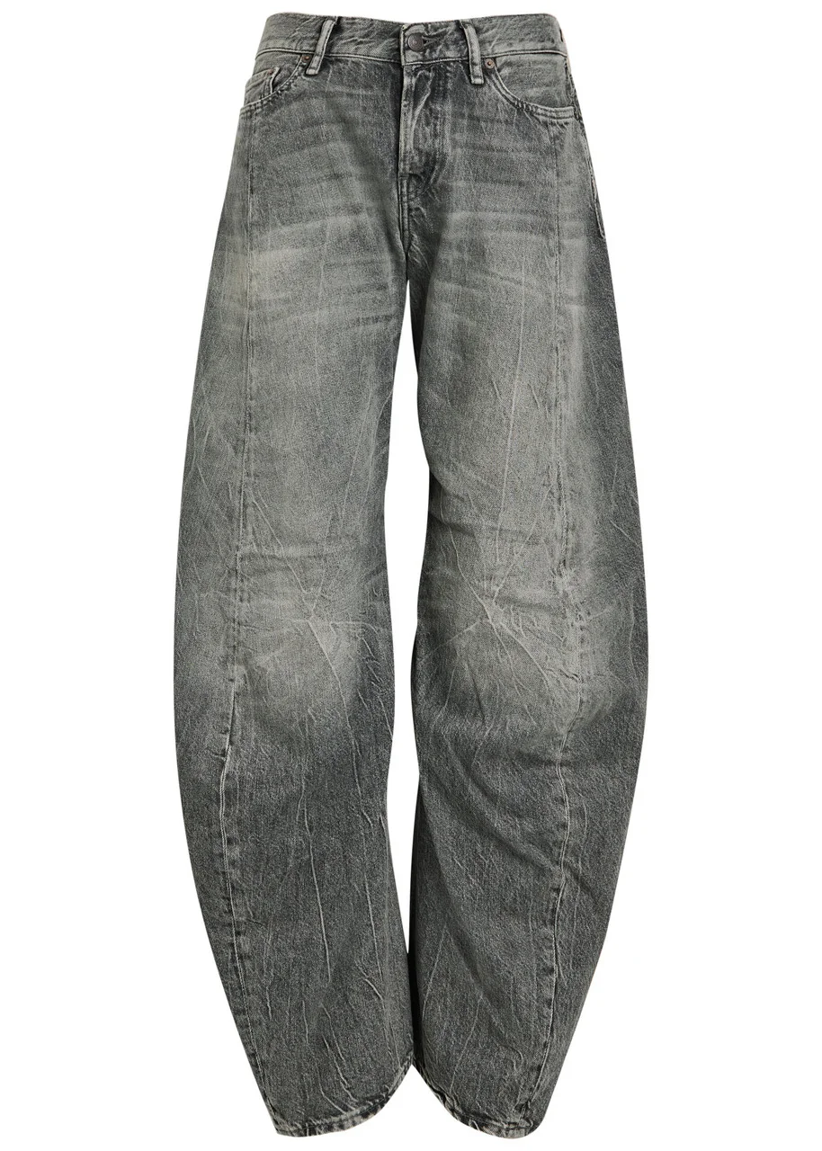 Info & Care Acne Studios denim jeans Low-rise fit, barrel-leg cut, belt loops, five pockets, designer plaque, twisted seams through legs, whiskered and washed finish Partially concealed button fastenings at front 82% cotton, 18% lyocell Machine wash inside out to avoid colour transfer Size & Fit Front rise: 9.5 inches/ 24cm Inside leg length: 33 inches/ 84cm Midweight Model is 5'9"/ 175cm and wears a size W27