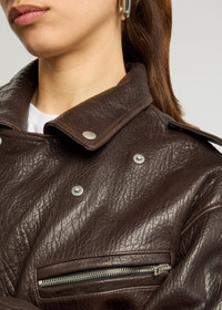 Info & Care Acne Studios grained leather jacket Press-stud fastening notched lapels, press-stud epaulettes at dropped shoulders, barrel sleeves, zip-fastening cuffs, three zip-fastening pockets, flap front press-stud fastening pocket at front, designer logo plaque at back neck, elasticated hem, two internal press-stud fastening pockets, fully lined Zip fastening through front 100% lamb leather; lining: 100% viscose Specialist clean Size & Fit Length shoulder to hem: 21 inches/ 53cm Midweight Boxy fit Model is 5'10"/ 178cm and wears a size small;