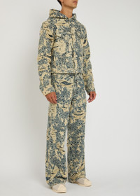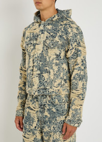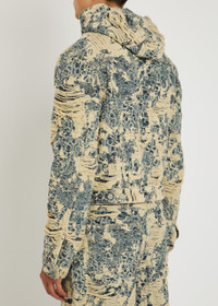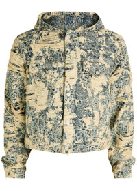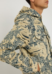 Info & Care Acne Studios denim jacket; Jacquard, hooded, distressed details, panelled, dropped shoulders, button-fastening cuffs, button-fastening flap pockets at chest, side slip pockets, adjustable button-fastening hem with tab Button fastenings through front; 100% cotton; Machine wash cold inside out to avoid colour transfer; Coordinating items available Size & Fit Length shoulder to hem: 22 inches/ 56cm Midweight Boxy fit Model is 6'1"/ 185cm, chest size 38.5 inches and wears a size medium