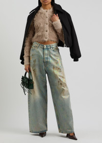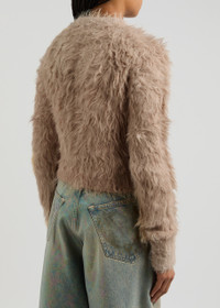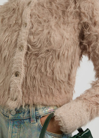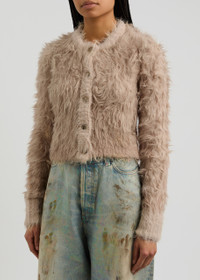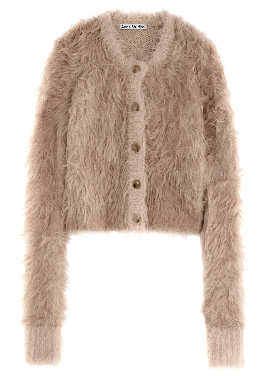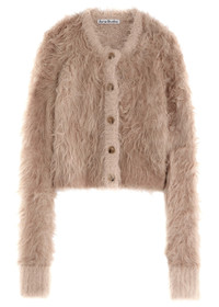 Info & Care Acne Studios knitted cardigan Brushed textured finish, round-neck, ribbed trims Button fastenings through front 82% nylon, 9% wool, 8% mohair, 1% elastane Hand wash Size & Fit Length shoulder to hem: 18 inches/ 46cm Midweight Regular fit, slightly cropped Model is 5'9"/ 175cm and wears a size small