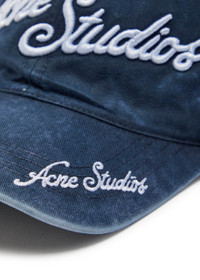 Info & Care Acne Studios cotton cap Logo embroidery at front and brim, embroidered eyelet details, concentric stitching at brim, washed and faded finish Adjustable fastening at back 100% cotton Dry clean Size & Fit Brim depth: 7cm