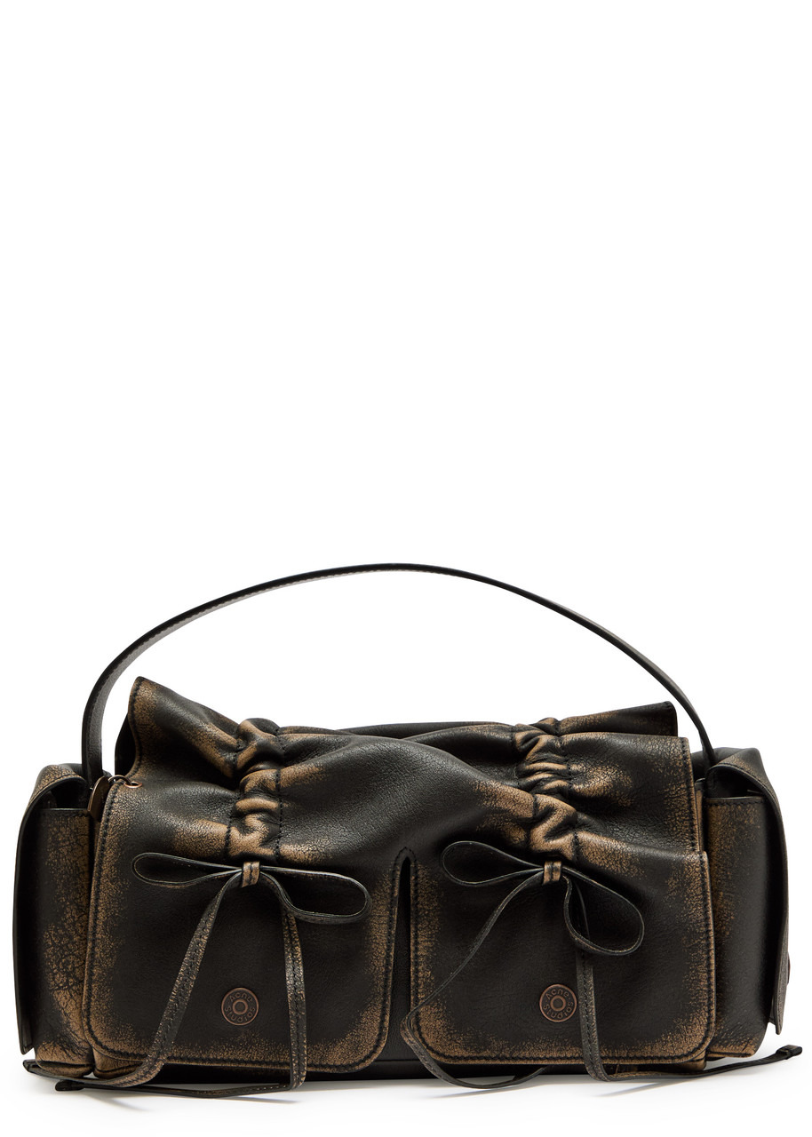 Info & Care Acne Studios leather top handle bag; Faded finish, logo-embossed top handle, heart hanging charm, designer-engraved hardware, ruched details with bow trims at front, magnetic-fastening flap patch pockets at sides, internal slip pocket, fully lined Concealed magnetic fastenings at flap front Size & Fit Width: 1: 11 inches/ 28cm; 2: 13 inches/ 33cm Height: 5 inches/ 13cm; Depth: 4 inches/ 10cm Top handle drop: 3 inches/ 7.5cm