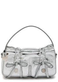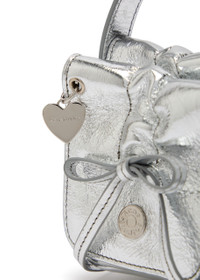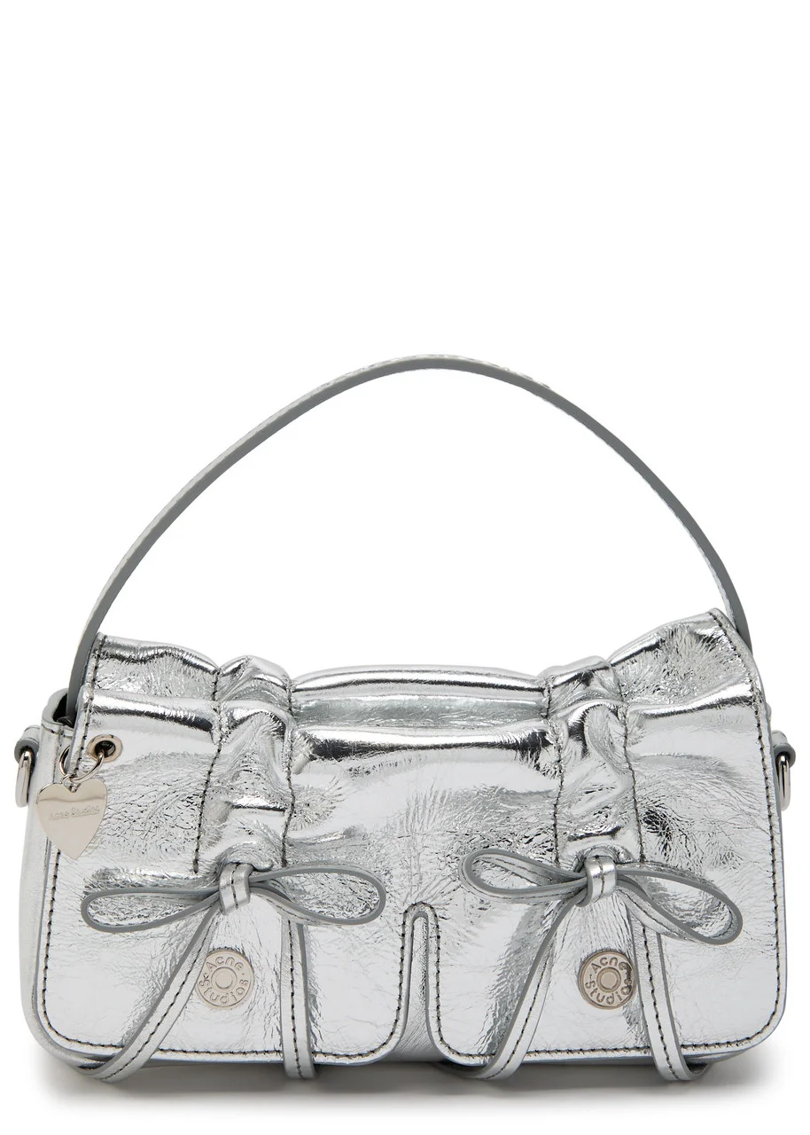 Info & Care Acne Studios metallic leather top handle bag; Logo-embossed top handle, detachable shoulder strap, heart hanging charm, ruched details with bow trims at front, magnetic-fastening flap patch pockets, back patch pocket, crinkled finish, two internal card slots, fully lined Concealed magnetic fastenings at flap front Size & Fit Width: 8.5 inches/ 21.5cm Height: 4 inches/ 10cm Depth: 2 inches/ 5cm Top handle drop: 3.5 inches/ 9cm Shoulder strap drop: 19.5 inches/ 49.5cm