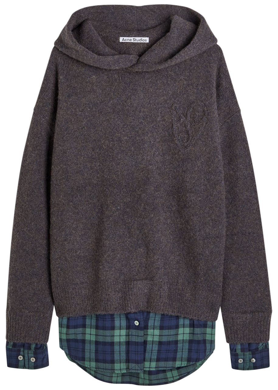 Info & Care Acne Studios brushed wool-blend;jumper Plaid shirt-effect;underlay,;hood, dropped shoulders, adjustable button-fastening cuffs at underlay, logo embroidery, ribbed trims, longer back hem at underlay Slips on 37% alpaca wool, 31% yak wool, 22% nylon, 16% wool; trims: 100% cotton Hand wash Size & Fit Length shoulder to hem: 30 inches/ 76.5cm; back: 32 inches/ 81.5cm Midweight Relaxed fit Model is 5'9"/ 175cm and wears a size small