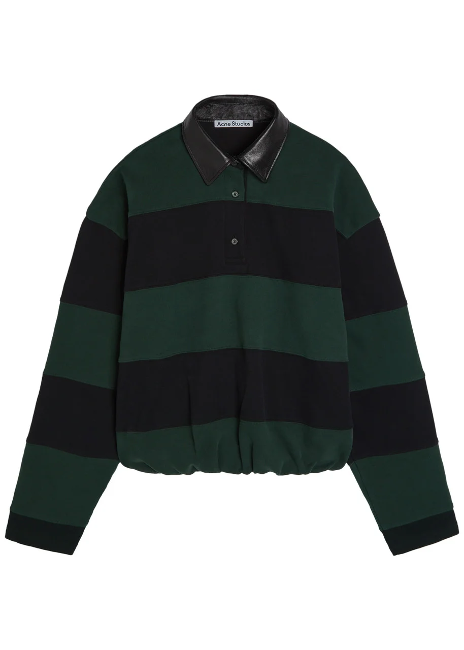 Info & Care Acne Studios cotton rugby top; Striped, leather collar, button-fastening neck, designer plaque at back, elasticated balloon hem, fully lined Slips on 100% cotton Hand wash Size & Fit Length shoulder to hem: 24 inches/ 61cm Midweight Relaxed fit Model is 5'8"/ 173cm and wears a size small