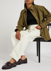 Info & Care Aeyde leather loafers Eyelet embellishments with woven detail, pintuck detail at heel, stacked wooden heel, rubber sole, almond toe; Slip-on; Size & Fit Only available in full sizes, go up to the nearest whole size if you take a half size