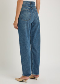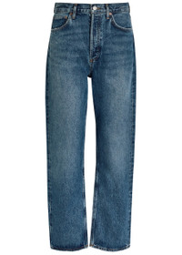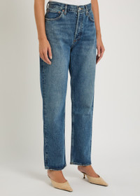 Info & Care Agolde denim jeans High-rise fit, straight-leg cut, belt loops, five pockets, slightly whiskered, distressed trims, faded finish Partially concealed button fastenings at front Designer wash:;Essence 67% regenerative cotton, 22% lyocell, 11% post consumer recycled cotton Machine wash cold inside out to avoid colour transfer Size & Fit Front rise: 11 inches/ 28cm; Inside leg length: 28 inches/ 71.5cm Midweight; Model is 5'9"/ 175cm and wears a size W27
