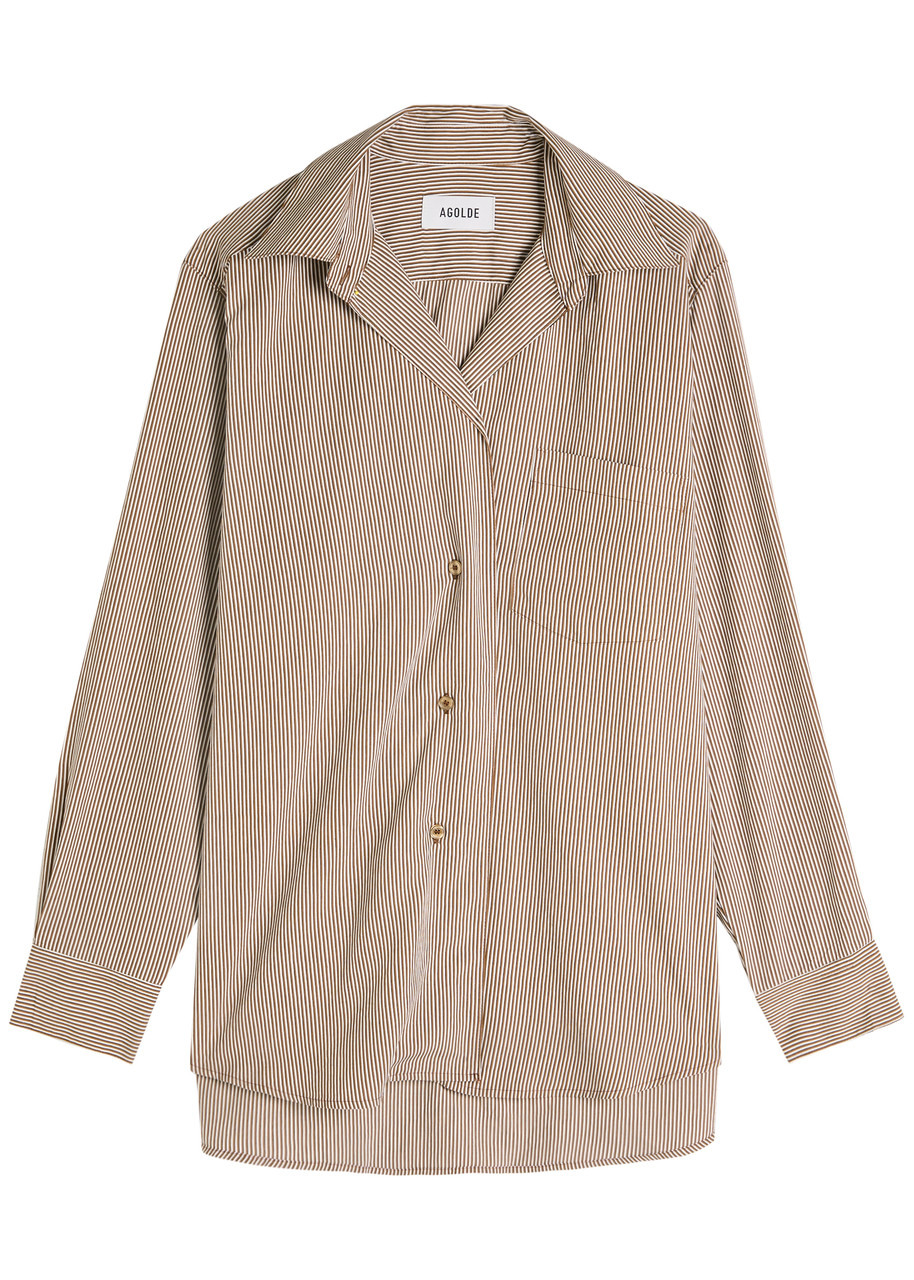 Info & Care Agolde woven shirt Striped, button-fastening cuffs, chest patch pocket, curved hem; Asymmetric button fastenings through front 88% viscose, 12% polyamide Hand wash Size & Fit Length shoulder to hem: 27 inches/ 68.5cm Midweight Loose fit, slim across the shoulders Model is 5'10"/ 178cm and wears a size small
