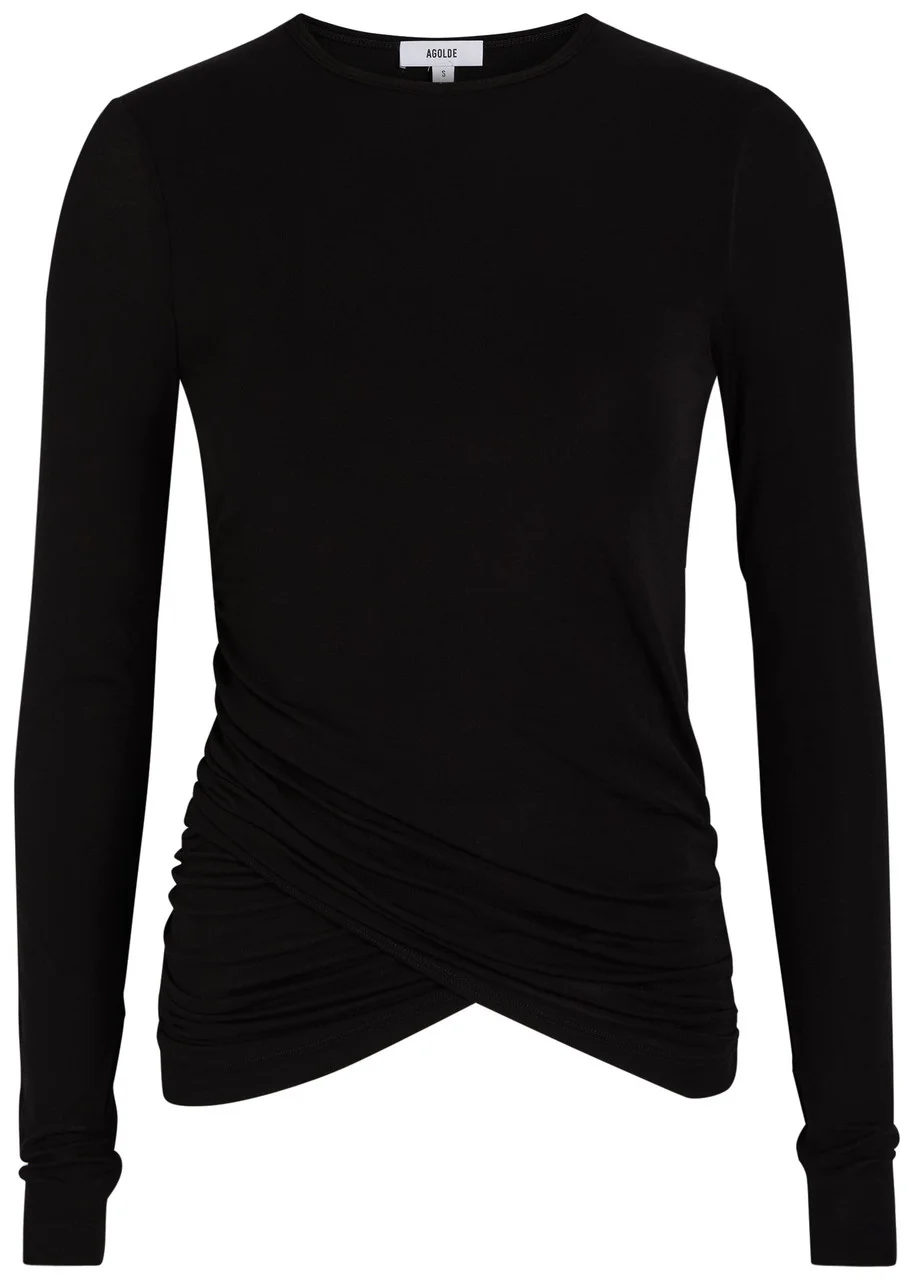 Info & Care Agolde jersey top Crew-neck, cross-over panel, ruched sides Slips on 94% lyocell, 6% spandex Hand wash Size & Fit Length shoulder to hem: 26 inches/ 66cm Midweight Slim fit Model is 5'9"/ 175cm and wears a size small