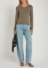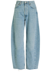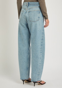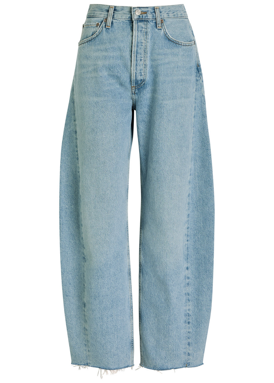 Info & Care Agolde denim jeans High-rise fit, barrel-leg cut, belt loops, five pockets, frayed cuffs, whiskered, distressed details, faded finish Partially concealed button fastenings at front Designer wash:;Void 100% regenerative cotton Machine wash cold inside out to avoid colour transfer Size & Fit Front rise: 11 inches/ 28cm Inside leg length: 29 inches/ 73.5cm Midweight; Model is 5'9"/ 175cm and wears a size W27