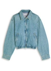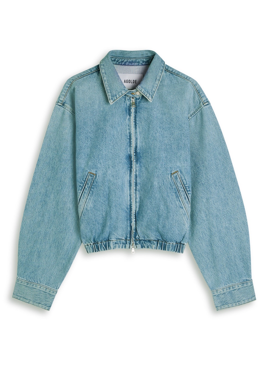 Info & Care Agolde blue denim jacket Button-fastening neck-tab, dropped shoulders, pleats at button-fastening cuffs, two front slip pockets, elasticated balloon hem, faded finish Two-way zip fastening through front 100% regenerative cotton Machine wash inside out to avoid colour transfer Size & Fit Length shoulder to hem: 21 inches/ 53.5cm Midweight Relaxed fit, boxy style Model is 5'9"/ 175cm and wears a size small;;