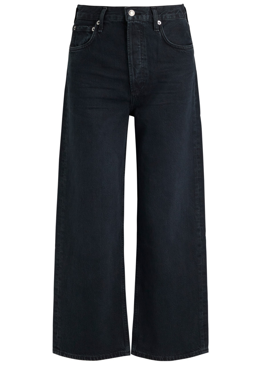 Info & Care Agolde denim jeans; High-rise fit, wide-leg cut, belt loops, five pockets, designer-engraved hardware, whiskered, faded finish Partially concealed button and zip-fastening at front; Designer wash:;Scowl 100% organic cotton Machine wash cold inside out to avoid colour transfer Size & Fit Front rise: 12 inches/ 30.5cm Inside leg length: 27 inches/ 69cm Midweight; Model is 5'9"/ 175cm and wears a size W27