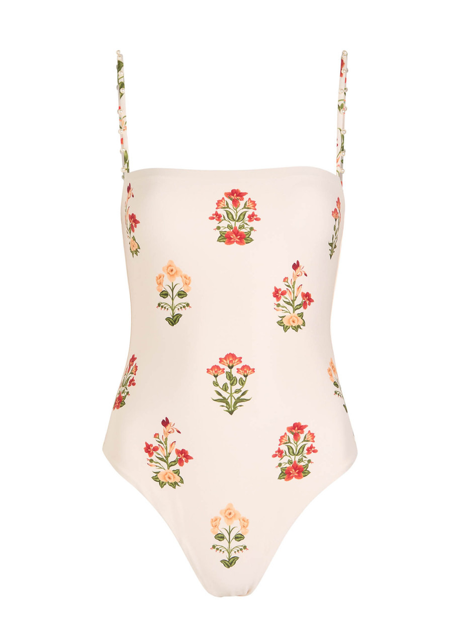 Info & Care Agua by Agua Bendita stretch-polyester;swimsuit; Floral print, elasticated shoulder straps with faux pearl embellishments, square-neck, elasticated trims, fully lined 81% recycled polyester, 19% elastane; lining: 78% polyamide, 22% elastane Machine wash Size & Fit Model is 5'9"/ 175cm and wears a size small