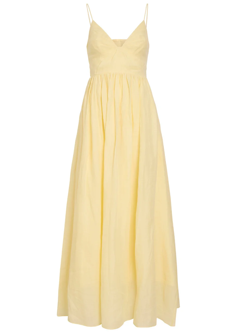 Info & Care Aje ramie dress V-neck,;pleated;detail at bust, pleats at waistband, shirred panel at back, fully lined Zip and button fastening through back; 100% ramie; lining: 100% cotton Dry clean; Size & Fit Length shoulder to hem: 57 inches/ 145cm Midweight Slim fit bodice, flared skirt from waist Model is 5'10"/ 178cm and wears a size UK8