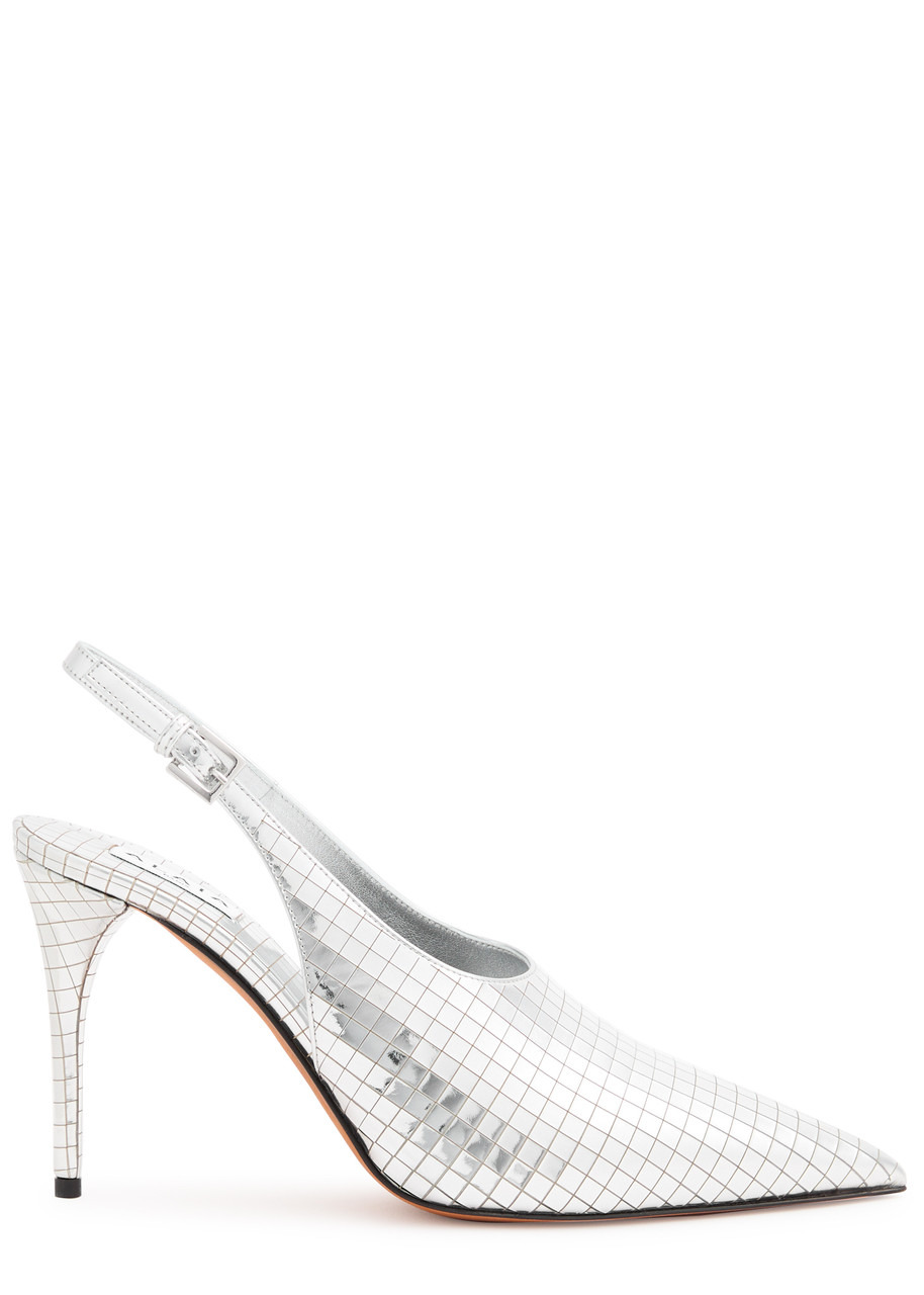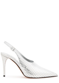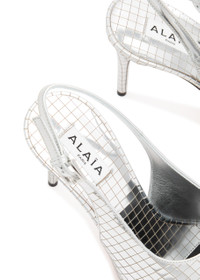 Info & Care Alaia;metallic leather pumps Heel measures approximately 3.5 inches/ 90mm Grid design, pointed toe Adjustable buckle-fastening slingback ankle strap Presented in a designer-stamped box Size & Fit Only available in full sizes, go up to the nearest whole size if you take a half size