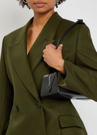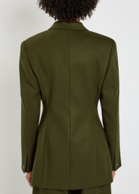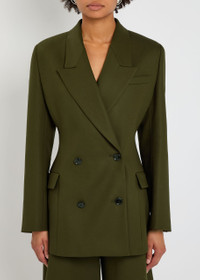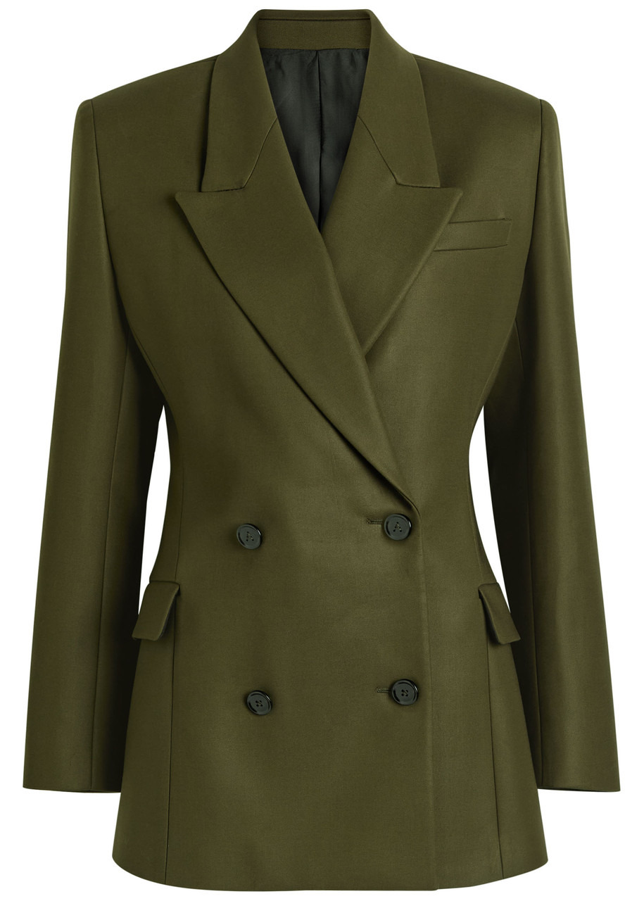 Info & Care Alaia;cotton blazer Peaked lapels, padded shoulders, logo embroidery at cuffs, chest slit pocket, darted, two front flap pockets, internal button-fastening pocket, fully lined Double-breasted button fastenings at front 100% cotton; lining: 100% cupro Dry clean Size & Fit Length shoulder to hem:;29.5 inches/ 75cm Midweight Regular fit, slim across the waist Model is 5'9"/ 175cm and wears a size FR36