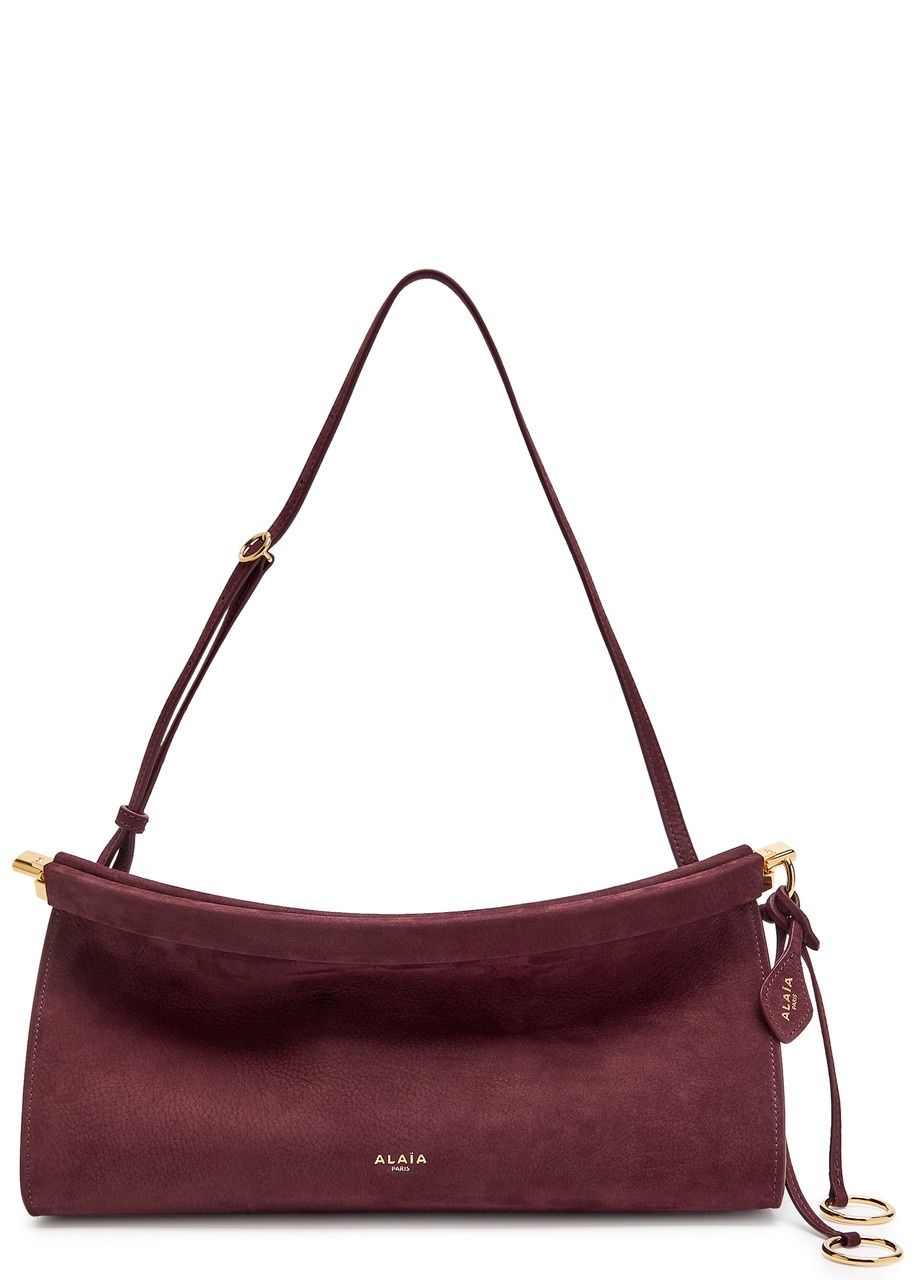 Info & Care Alaia suede shoulder bag; Adjustable top handle strap, metallic designer stamp, detachable metal ring-embellished charm, fully lined Magnetic fastening at top Size & Fit Width: 12 inches/ 30.5cm Height: 5.5 inches/ 14cm Depth: 3 inches/ 7.5cm Min. shoulder strap;drop: 9.5 inches/ 24cm Max. shoulder strap;drop: 12 inches/ 30.5cm