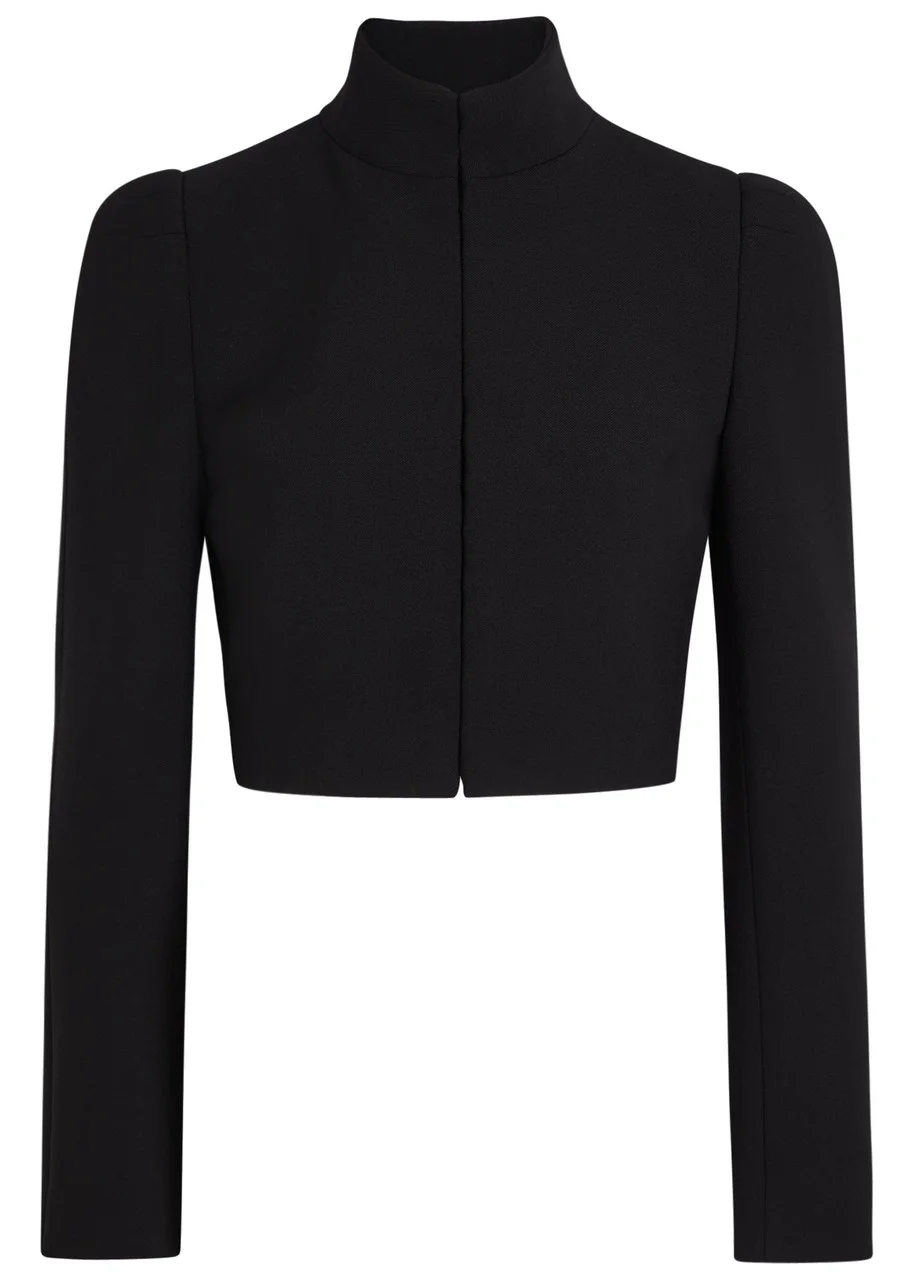 Info & Care Alaia cavalry twill jacket Funnel-neck, padded shoulders, fully lined Concealed hook fastenings through front 53% polyester, 43% virgin wool, 4% elastane; lining: 100% cupro Dry clean Size & Fit Length shoulder to hem: 15.5 inches/ 39.5cm Midweight Slim fit, cropped Model is 5'10"/ 178cm and wears a size;FR36