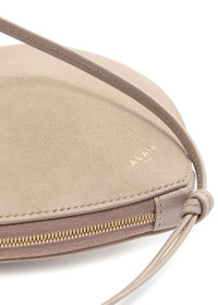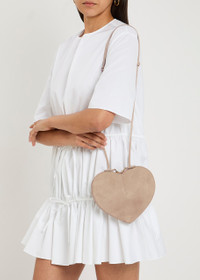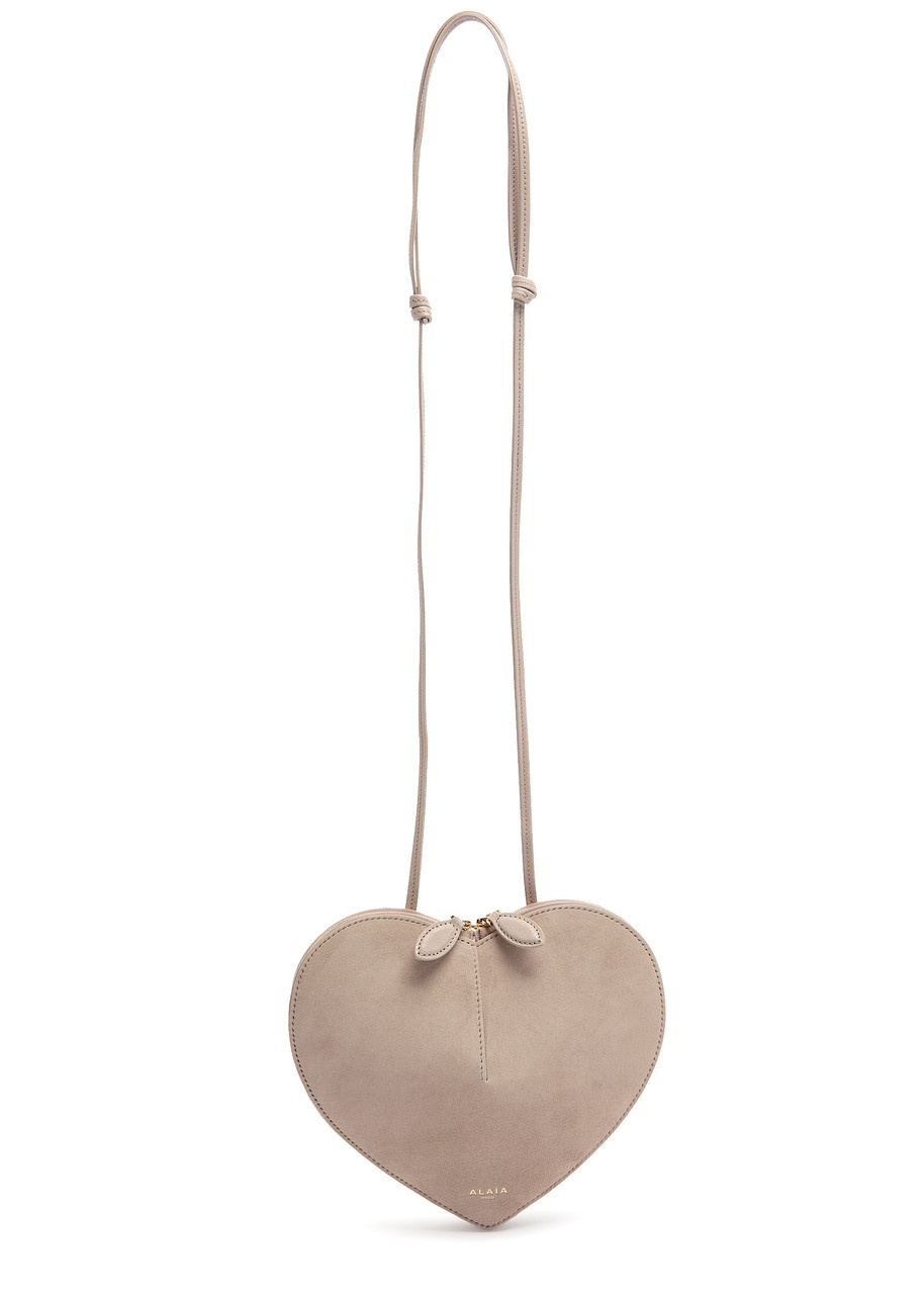 Info & Care Alaia suede cross-body bag; Leather shoulder strap with knotted details, heart design, designer stamp, fully lined Two-way zip fastening across top Size & Fit Width: 8.25 inches/ 21cm; Height: 7.5 inches/ 19cm; Depth: 1 inch/ 2.5cm; Shoulder strap drop: 20.5 inches/ 52cm;