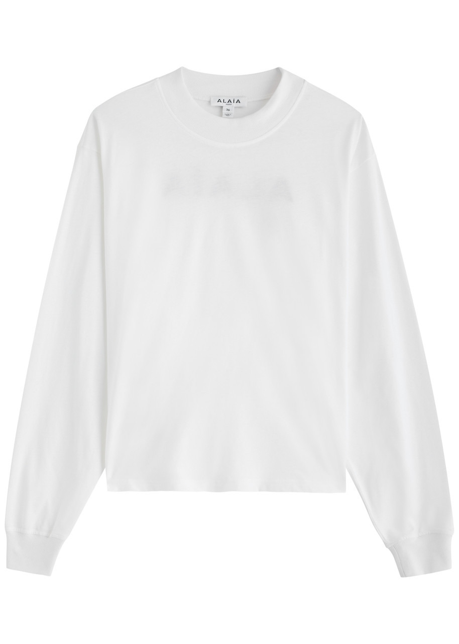 Info & Care Alaia cotton top High-neck, dropped shoulders, logo embroidery at back, ribbed trims Slips on 100% cotton Machine wash Size & Fit Length shoulder to hem: 22 inches/ 56cm Midweight Relaxed fit Model is 5'9"/ 175cm and wears a size FR36
