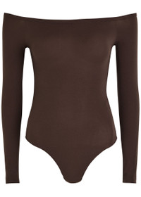 Info & Care Alaia;stretch-nylon bodysuit Elasticated off-the-shoulder neck, rolled trim at base Concealed press-stud fastenings at base 75% polyamide, 25% elastane Dry clean Size & Fit Length shoulder to base: 19 inches/ 48.5cm Midweight Close fit Model is 5'9"/ 175cm and wears a size FR36