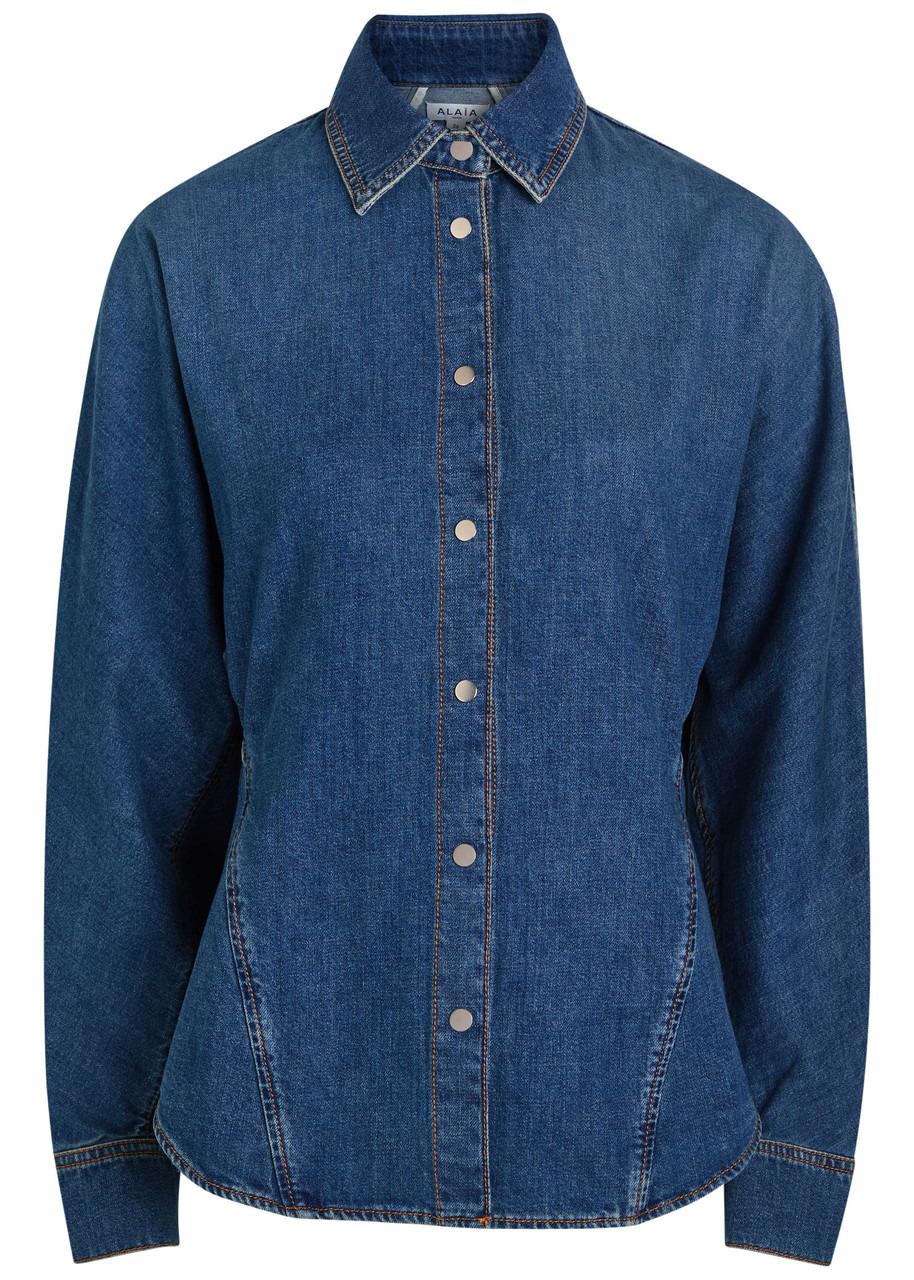 Info & Care Alaia;denim shirt Panelled, dolman sleeves, press-stud fastening cuffs, pleated details at waist, contrasting stitching, curved hem, faded finish Press-stud fastenings through front 100% cotton Machine wash cold inside out to avoid colour transfer Size & Fit Length shoulder to hem:;26 inches/ 66cm Midweight Regular fit Model is 5'9"/ 175cm and wears a size FR36
