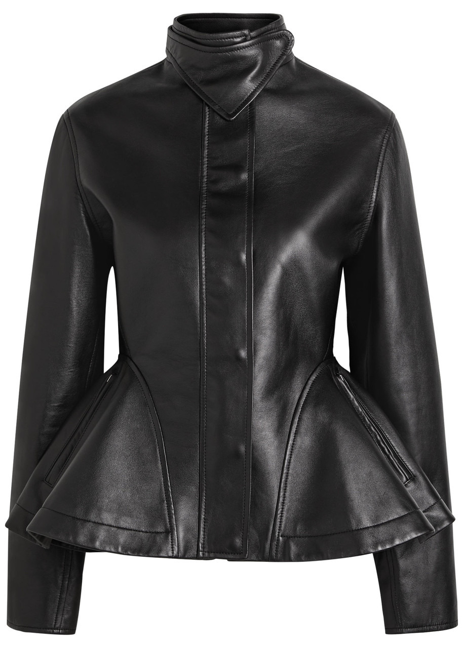 Info & Care Alaia;leather jacket Panelled, press-stud fastening tab at high-neck, zip-fastening cuffs, two zip-fastening side pockets, peplum hem, fully lined Concealed zip and press-stud fastenings through front 100% lambskin; lining: 100% polyamide Specialist clean Size & Fit Length shoulder to hem:;24 inches/ 61cm Midweight Slim fit, flared from the waist Model is 5'9"/ 175cm and wears a size FR36