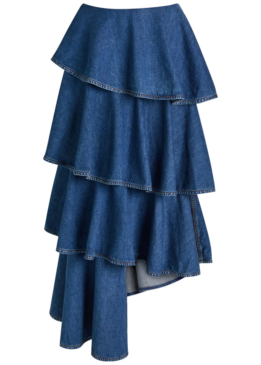 Info & Care Alaia denim skirt Tiered, side slip pockets, contrasting stitching, asymmetric hem, faded finished Zip fastening at side 100% cotton Machine wash cold inside out to avoid colour transfer Size & Fit Length;waist to hem: 31 inches/ 79cm; 2: 42 inches/ 106cm Midweight Loose fit, slim across the waist Model is 5'9"/ 175cm and wears a size FR36