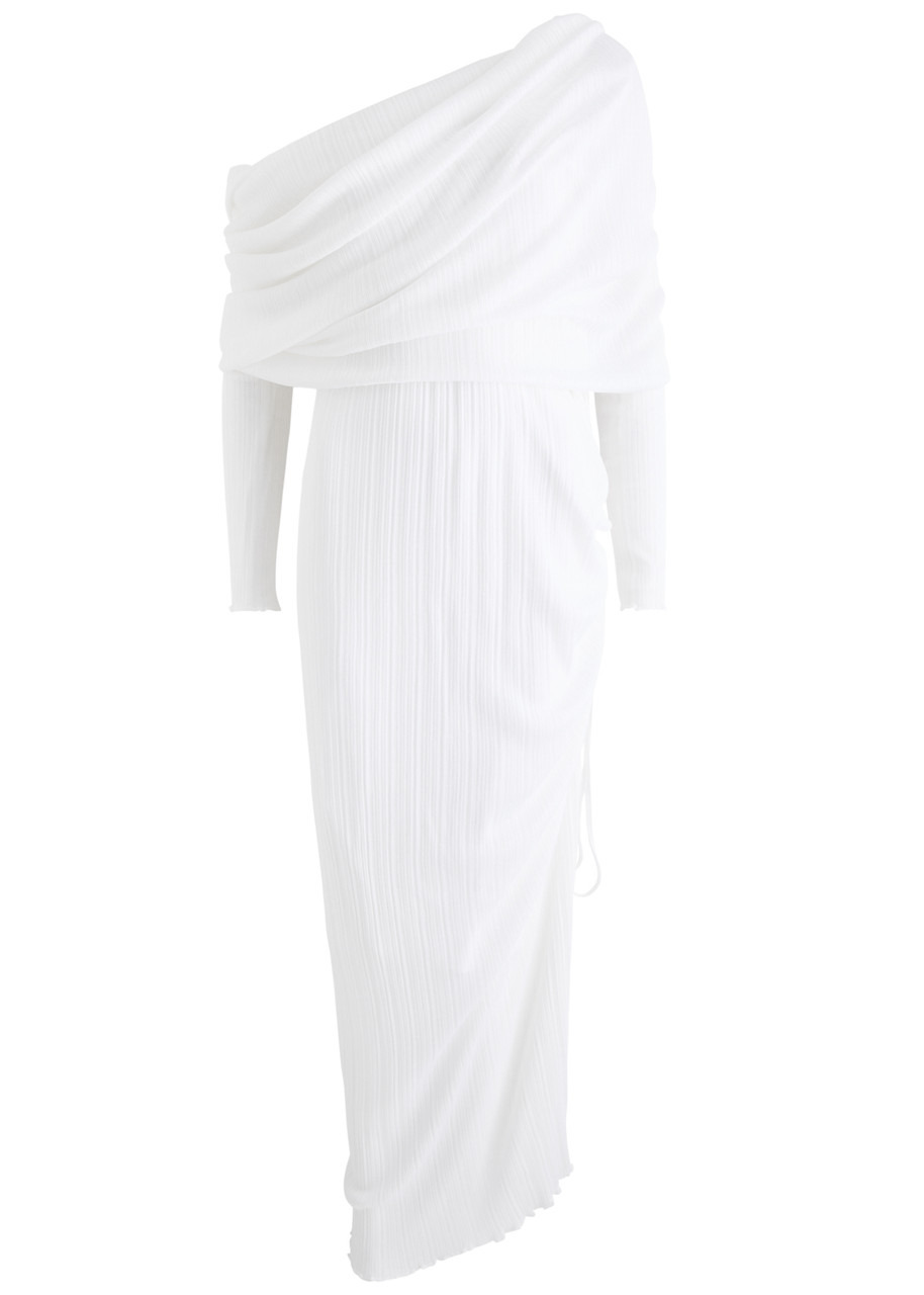 Off-the-shoulder plissé maxi dress