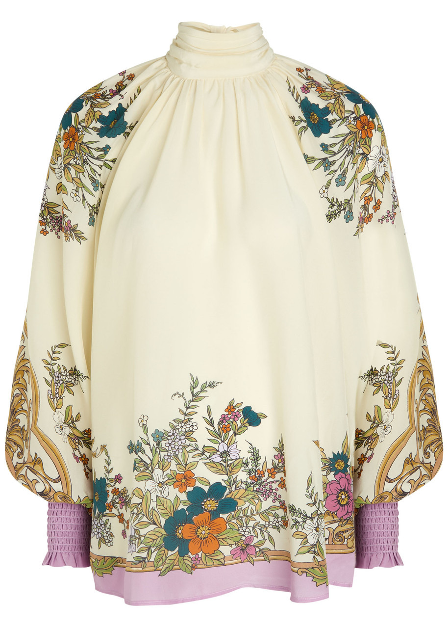 Info & Care Alemais chiffon blouse Floral print, high-neck with tie fastening at back, raglan sleeves, shirred cuffs, keyhole at back neck, pleated details, curved hem Slips on 65% viscose, 35% silk Dry clean; Size & Fit Length shoulder to hem: 29 inches/ 73.5cm Midweight Loose fit Model is 5'9"/ 175cm and wears a size;UK8