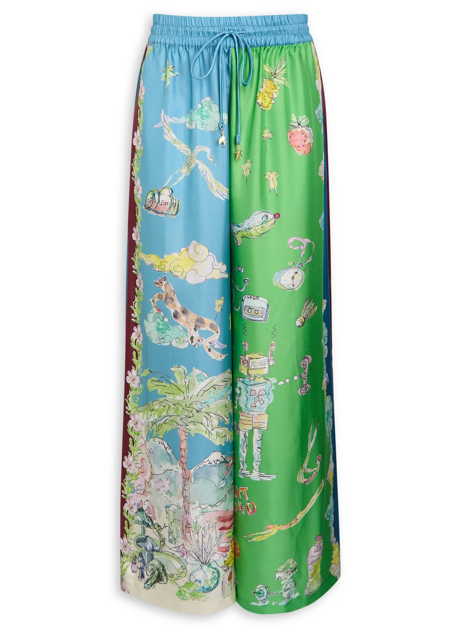 Info & Care Alemais silk-twill trousers Printed graphics, colour-block design, elasticated drawstring waistband, side slip pockets Pull on 100% silk Dry clean Coordinating items available Size & Fit Inside leg length: 31 inches/ 77.5cm Midweight Wide-leg cut Model is 5'9"/ 175cm and wears a size UK8