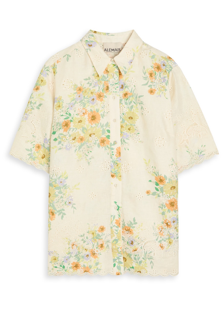 Info & Care Alemais flax shirt Open-embroidery, floral printed, embroidered scalloped trims; Button fastenings through front; 100% European Flax; Dry clean Co-ordinating item available; Size & Fit Length shoulder to hem: 27.5 inches/ 70cm Midweight Relaxed fit Model is 5'9"/ 175cm and wears a size;UK8