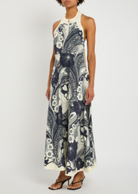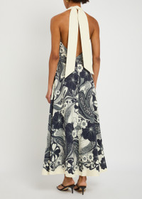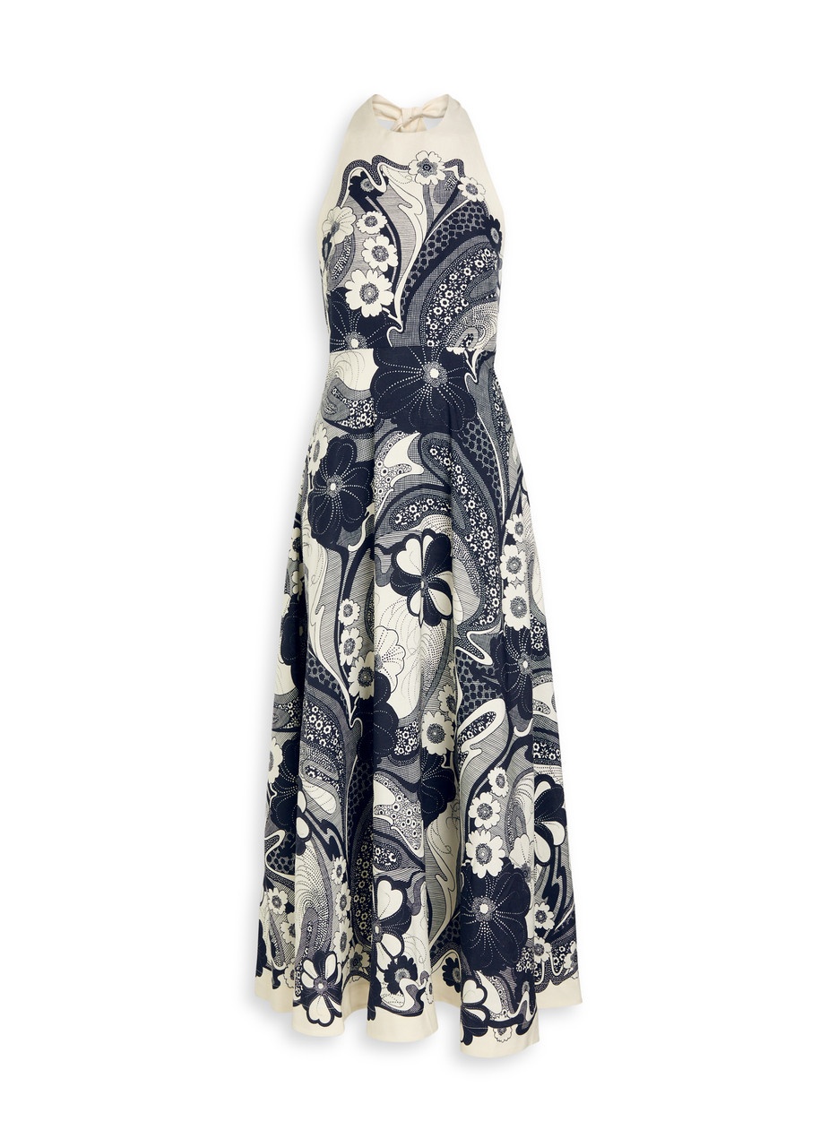 Info & Care Alemais woven dress Printed, tie-fastening halterneck, two concealed side slip pockets Concealed hook and zip fastening at back 55% silk, 45% linen Dry clean Size & Fit Length shoulder to hem: 54 inches/ 137cm Midweight Slim bodice, flared skirt Model is 5'9"/ 175cm and wears a size;UK8